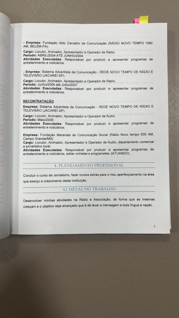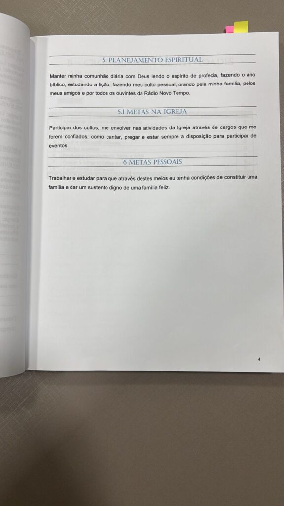 Com o objetivo de promover um melhor comportamento entre nossos colaboradores e fomentar o desenvolvimento organizacional em nossa associação, foi que, no ano de 2009, criamos o Projeto Cronograma para Escritório. Esse projeto tem como propósito reunir informações pertinentes a cada colaborador, tais como formação acadêmica, planejamento profissional e pessoal, metas relacionadas ao trabalho, à igreja e à vida pessoal. Além disso, contempla aquilo que era o nosso objetivo principal: o cronograma detalhado das atividades de cada colaborador — não apenas diário, mas também semanal, quinzenal, mensal e anual —, formando, assim, um ciclo completo e estruturado sobre as expectativas em relação a cada profissional.