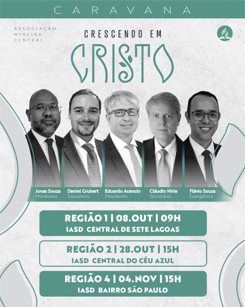 “Em 2023, foi criado o projeto “Caravana Crescendo em Cristo”. Ele teve início com uma live organizada em nível da Associação Mineira Central, voltada para novos conversos. A iniciativa partiu do tesoureiro Daniel Grubert, em parceria com o departamento de Mordomia Cristã da Associação.” (Pr. Jonas Souza, Departamental de Evangelismo da AMC, declaração pessoal, 2025).